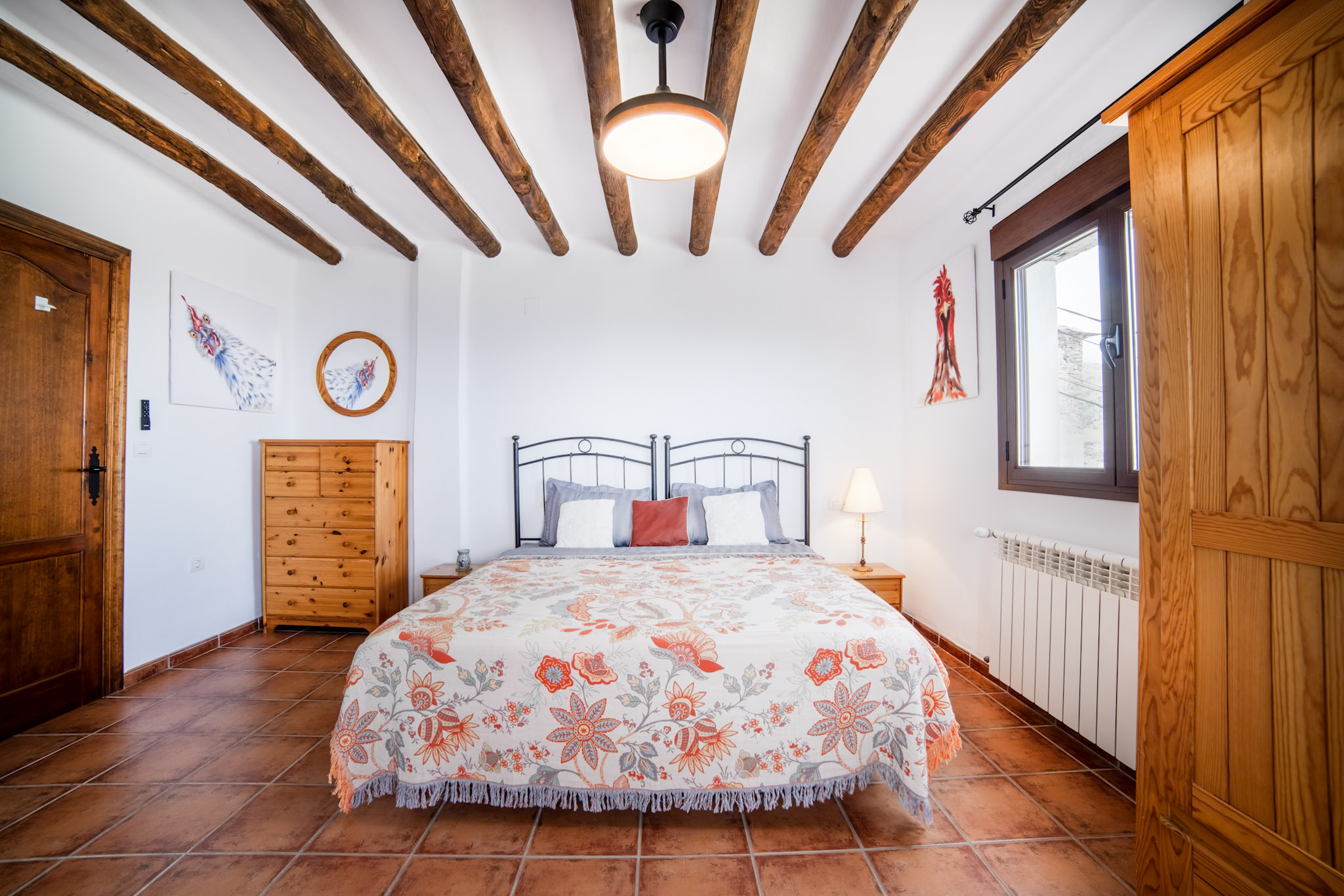The chicken-themed bedroom is located on the main floor and features a generous super king bed that can easily split into two singles, making it perfect for different group arrangements. Large windows fill the room with plenty of natural light and offer spectacular views that provide a beautiful backdrop whether you’re enjoying morning coffee or winding down in the evening.